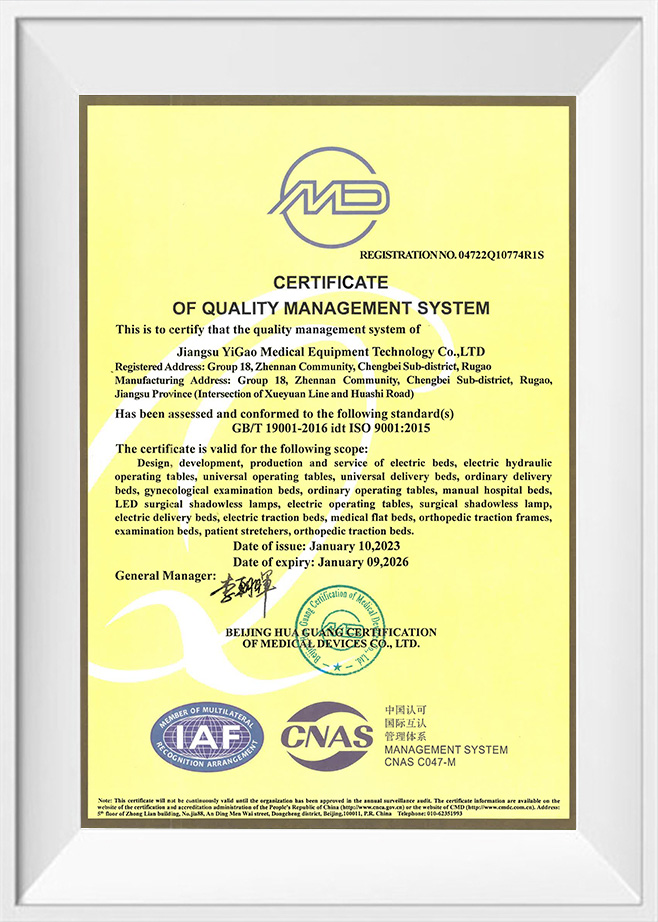 Ca o întreprindere care a trecut ISO 9001, ISO 13485, ISO 14001, ISO 45001 , precum și alte certificări ale sistemului de management, Jiangsu Yigao Medical Equipment Technology Co., Ltd. consideră calitatea produsului ca fiind un factor vital. Mesele noastre de operație respectă cu strictețe Standarde CE , ceea ce înseamnă că nu numai că îndeplinesc cerințele de siguranță, sănătate și mediu ale pieței europene, dar reprezintă și nivelul lider internațional în proiectarea și fabricarea produselor.